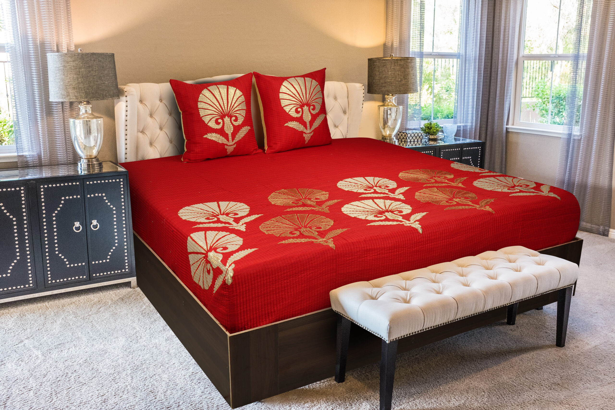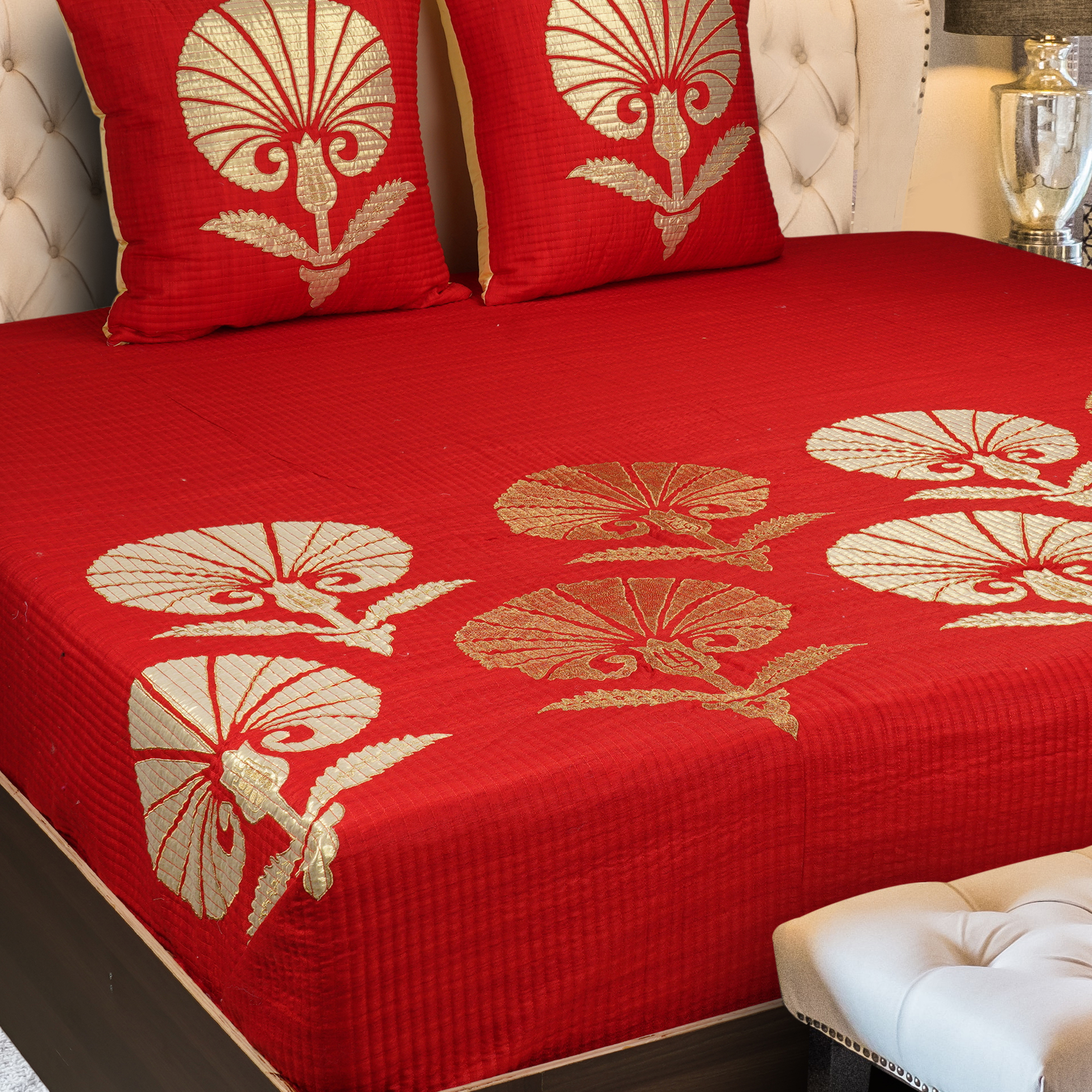 Graceful elegance meets plush texture in our Alaqua Bedspread. Made from soft faux silk with delicate dori embroidery in a Moroccan lattice pattern, it’s adorned with intricately thread-embroidered florals in gentle pastel tones coming together in a horizontal band. A timeless piece that brings vintage charm and refined warmth to any room.